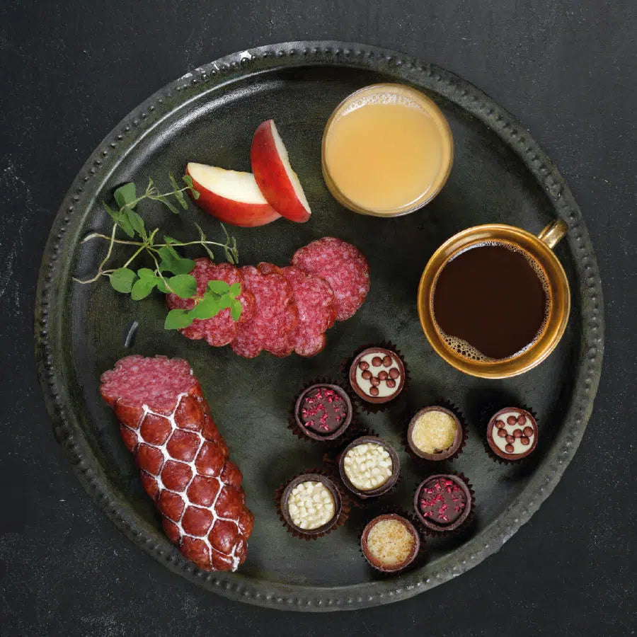 Gaven er pakket i en stilig trekasse og cellofan, og inneholder et nøye utvalgt utvalg av kvalitetsprodukter. Denne delikate sammensetningen av produkter byr på fristelser for både søtt og salt, og er perfekt for å nyte gode smaker i godt selskap. Den smakfulle kombinasjonen av norsk eplemost, belgisk sjokolade, førsteklasses kaffe og rødvinsalami gjør denne gaven til en glede å gi og motta!